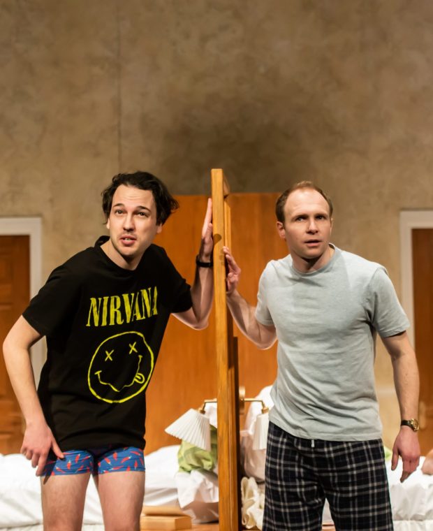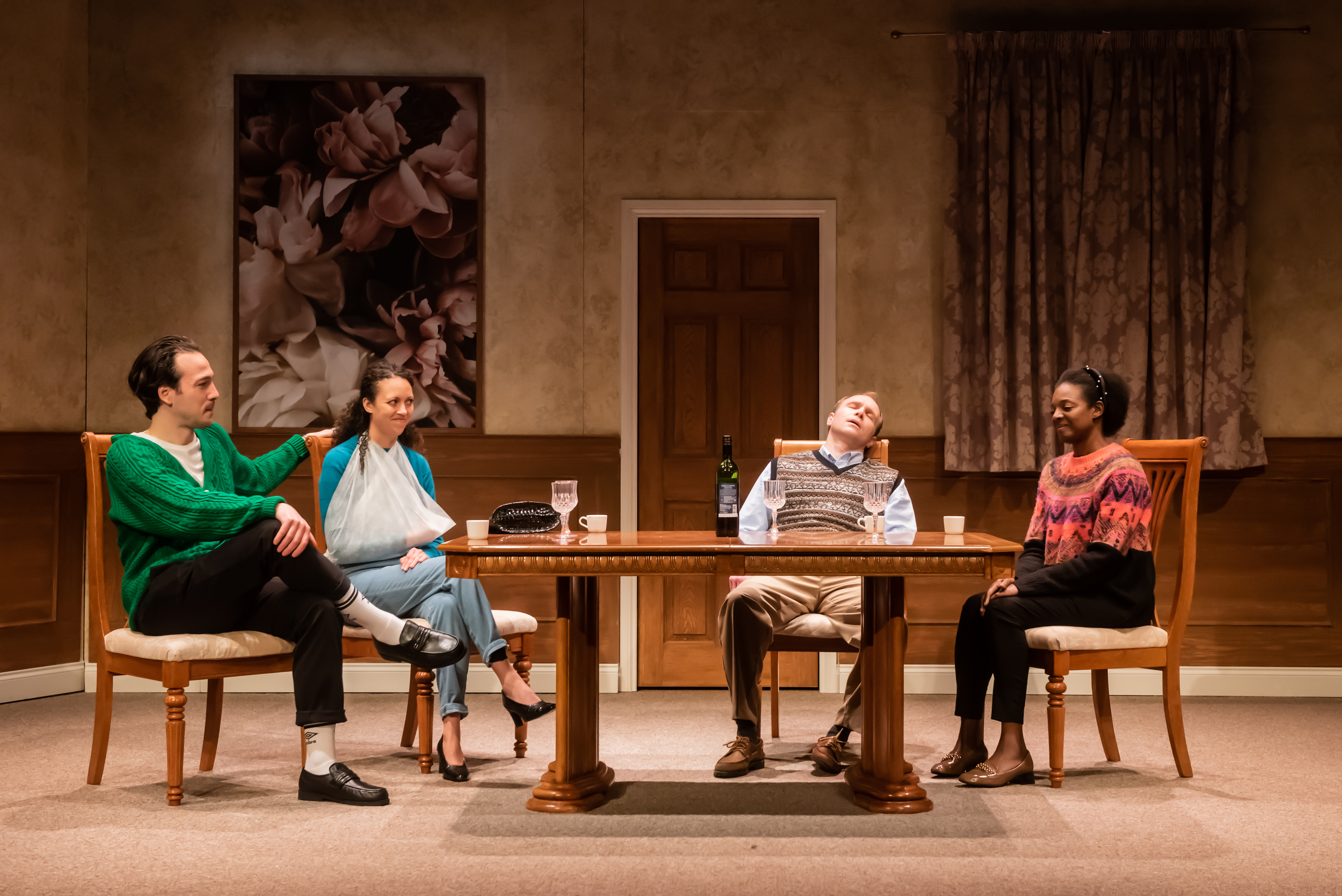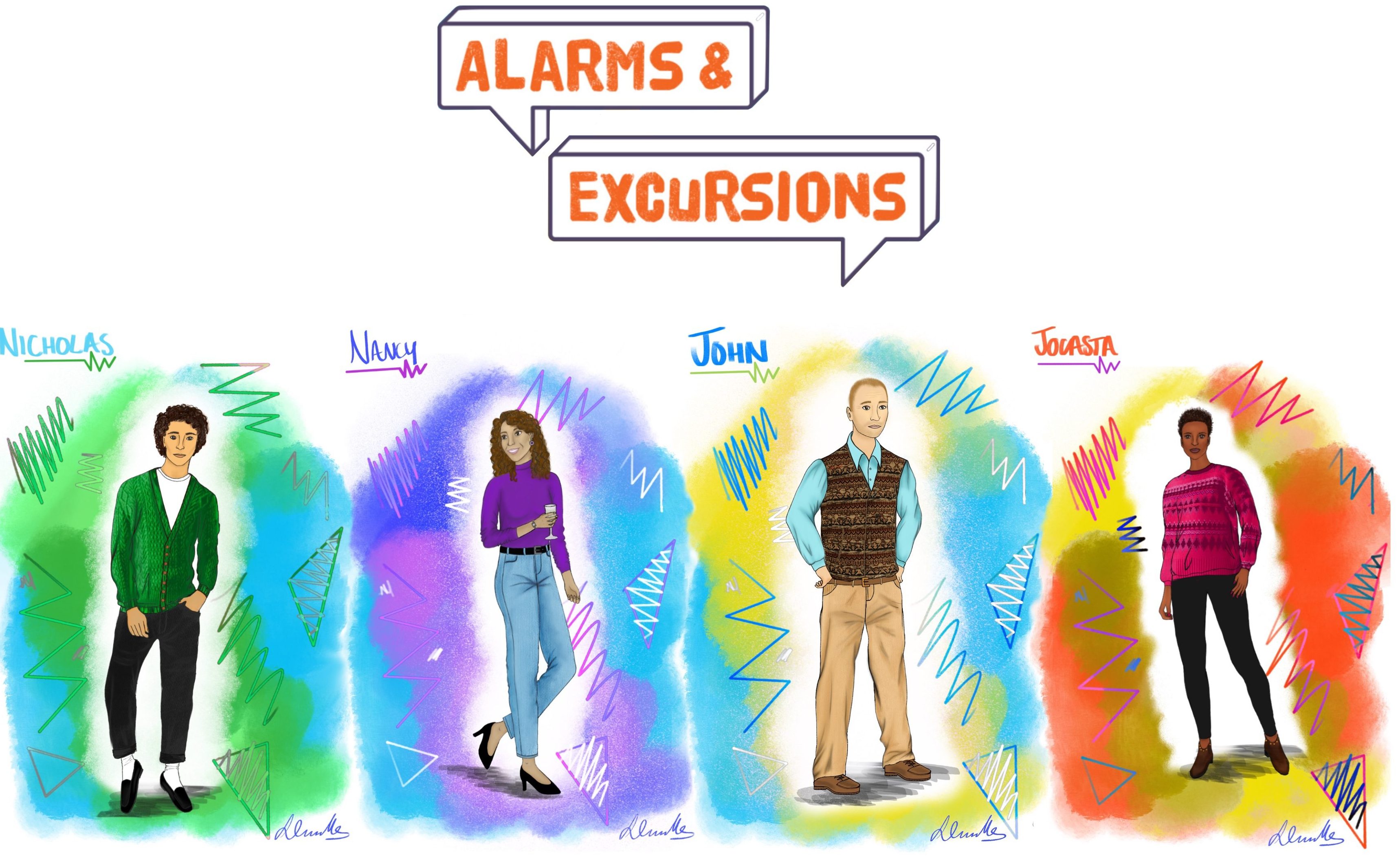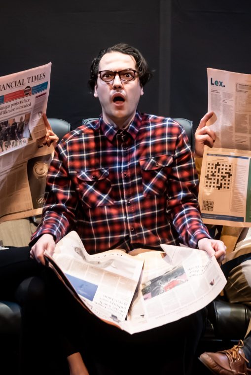 Alarms and Excursions opens with 4 friends sitting down to dinner, but they are interrupted by incessant beeping and buzzing noises. They must find out what the alarms are trying to tell them. This sets off a series of performances that explore and comment comically on a humans’ relationship with technology, and one another. From awkward work events, to aeroplane announcements and seating dilemmas, to back to back hotel rooms where we see a couple’s likelihood to fall into the same patterns of behaviour, particularly abroad, and a mad dash to find a friend who’s just arrived at an airport where we can only communicate through payphones and answer machines.