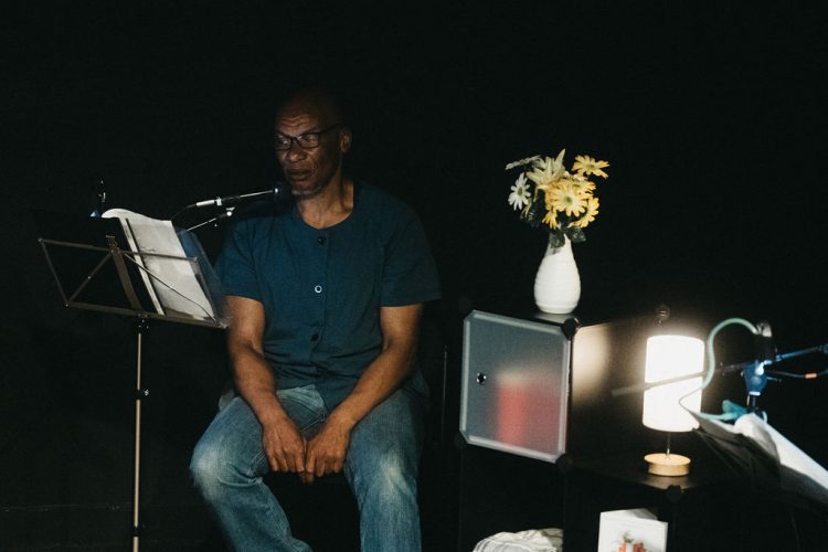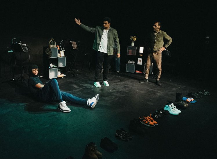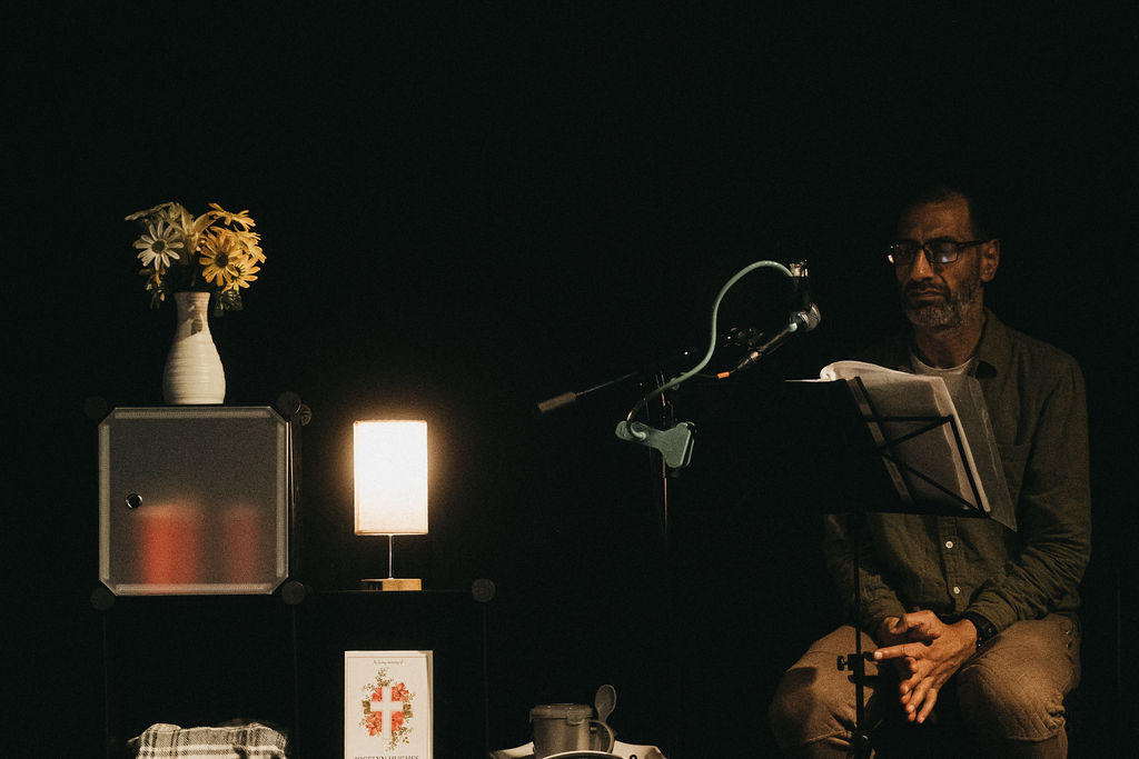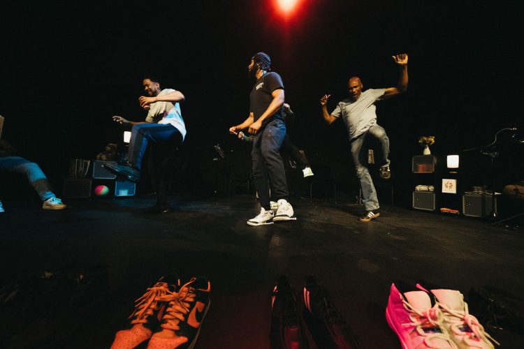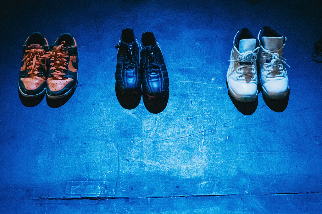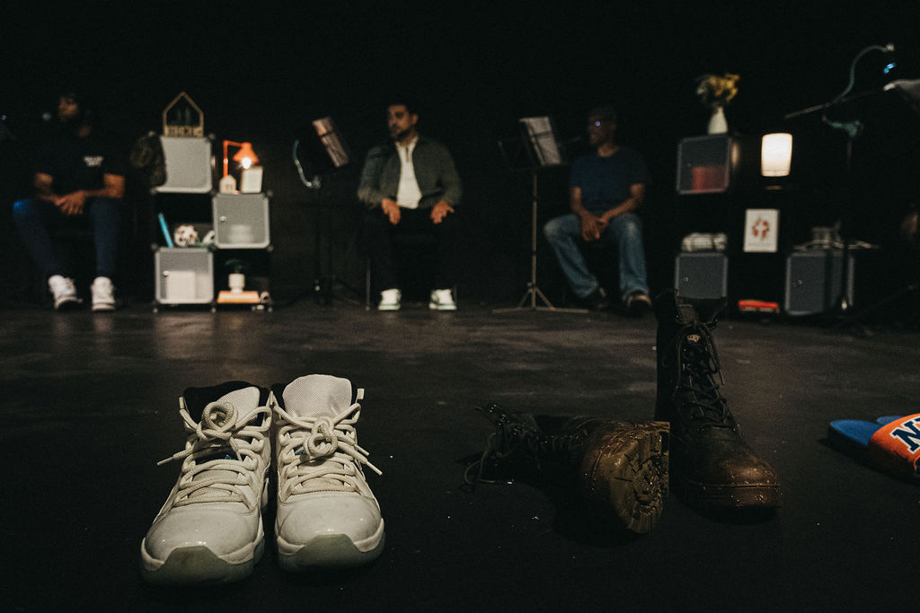 The show followed one man’s life from birth to death – the ordinary and the extraordinary, the everyday and the exceptional, all at once. The set followed this narrative with a line of shoes at the front of the performance space from left to right, from young to old, from knitted baby boots to army boots, from sliders to slippers, as well as storage cubes adding pockets of details and props that were interacted with throughout the performance.