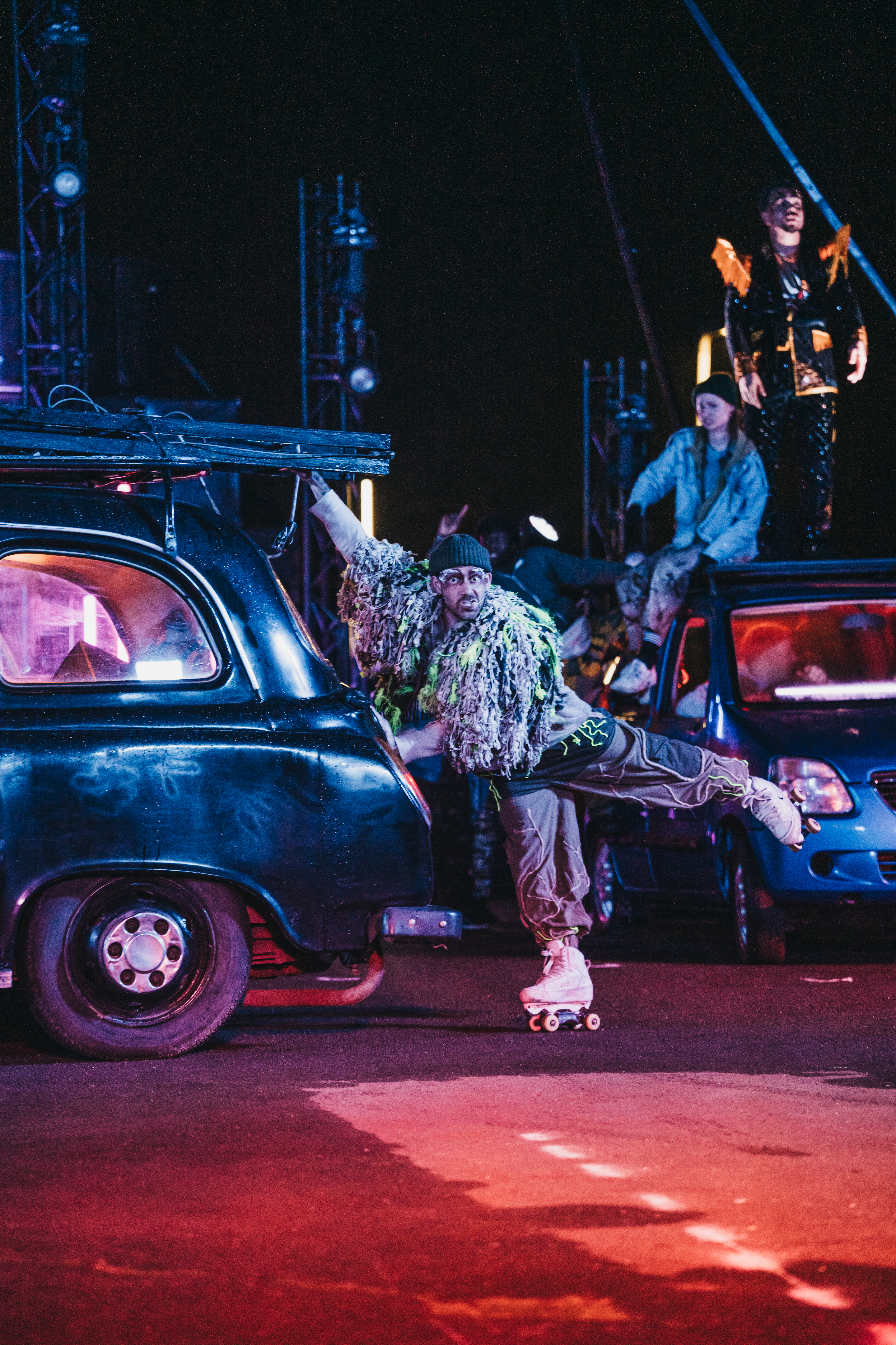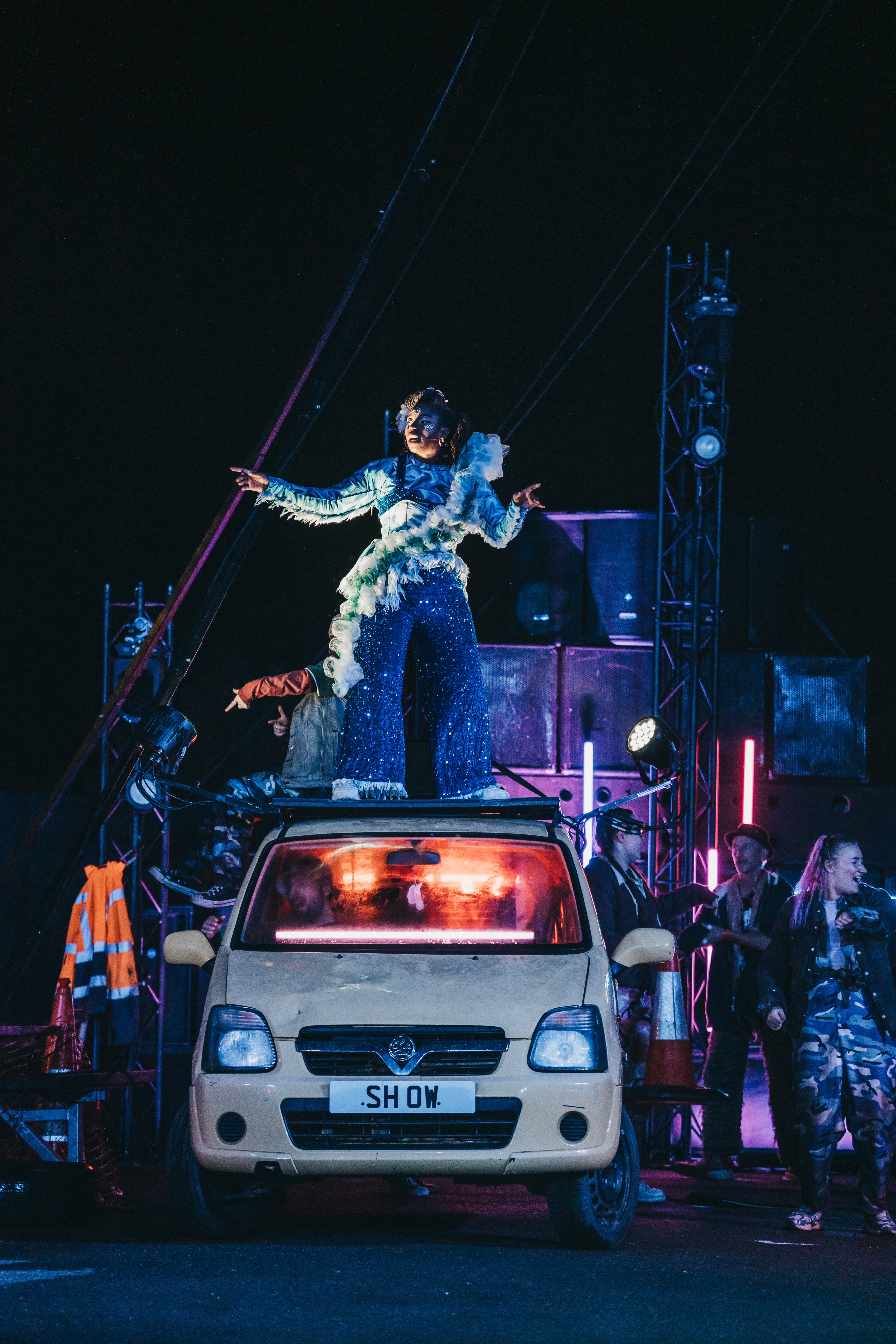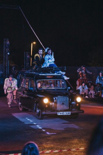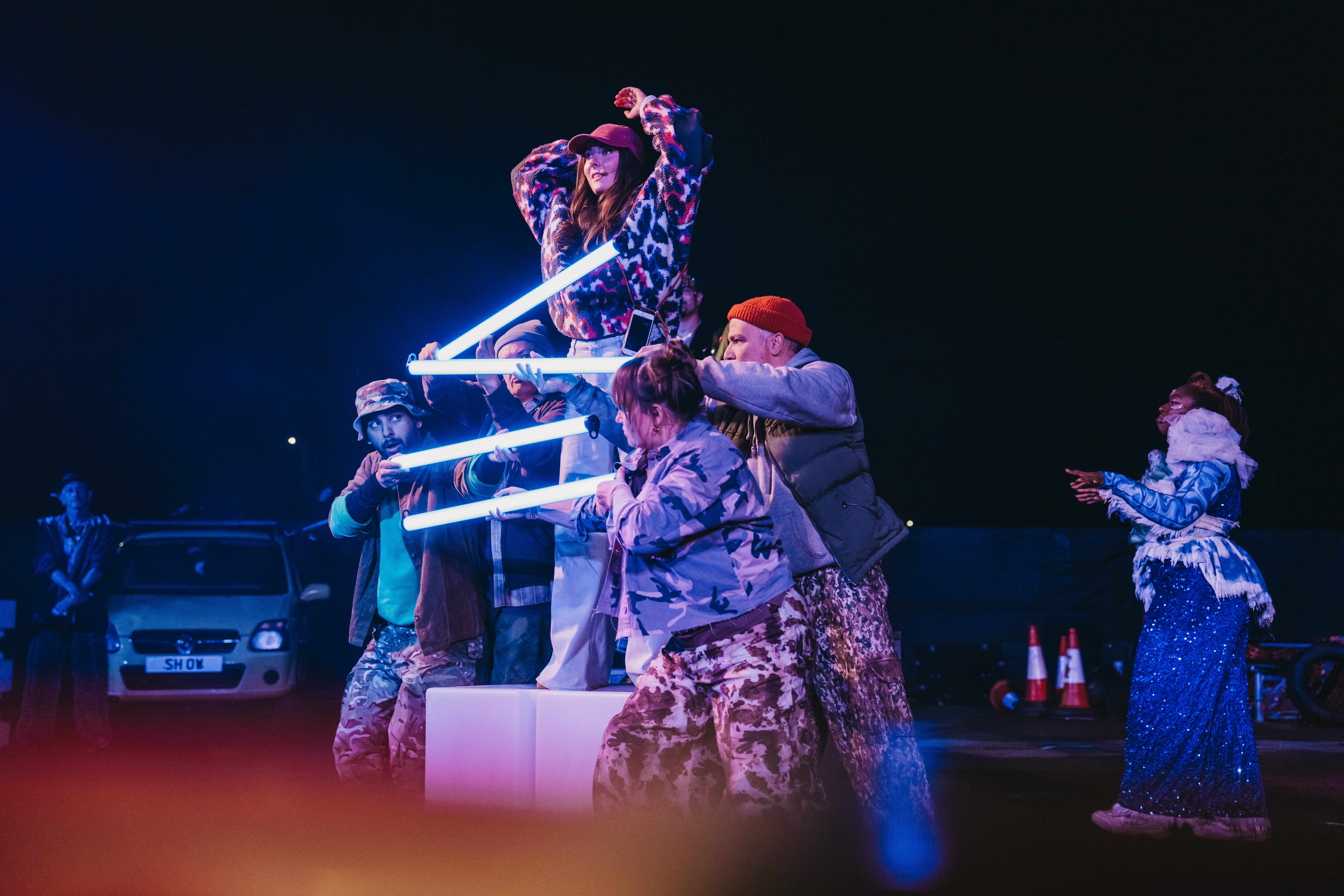 Rave New World is a spectacular new outdoor show told through lyrics, music, aerial theatre, and moving cars.