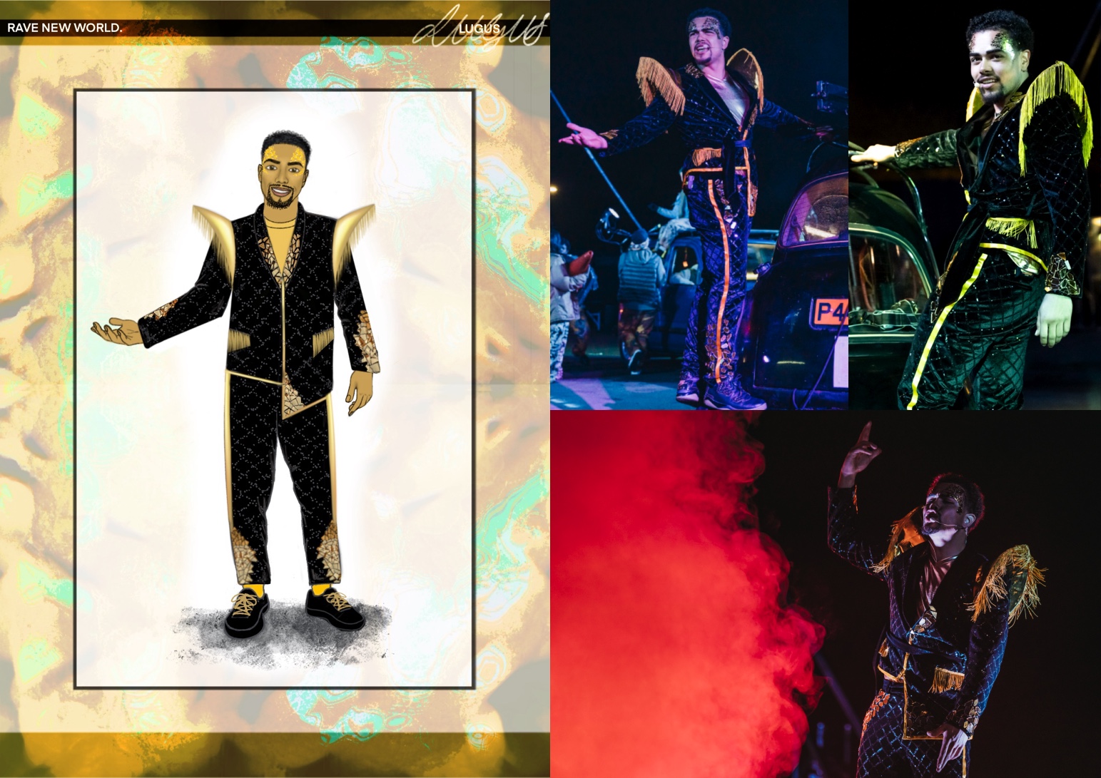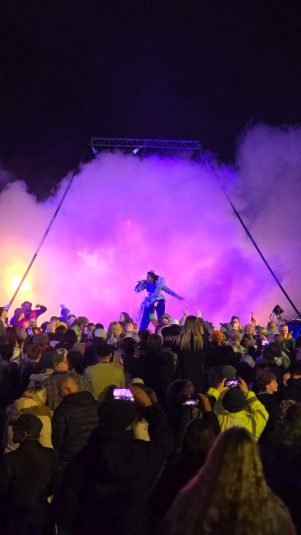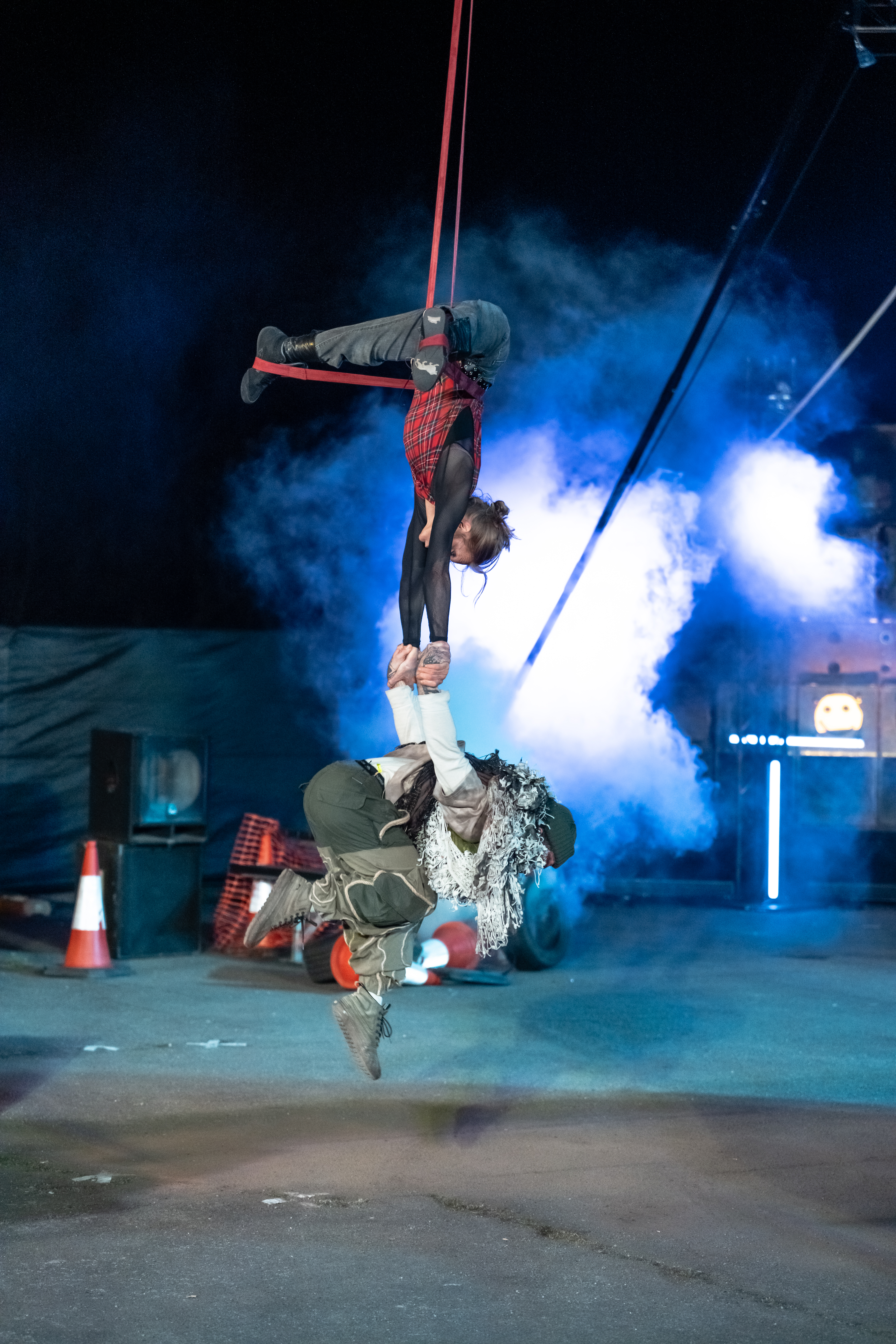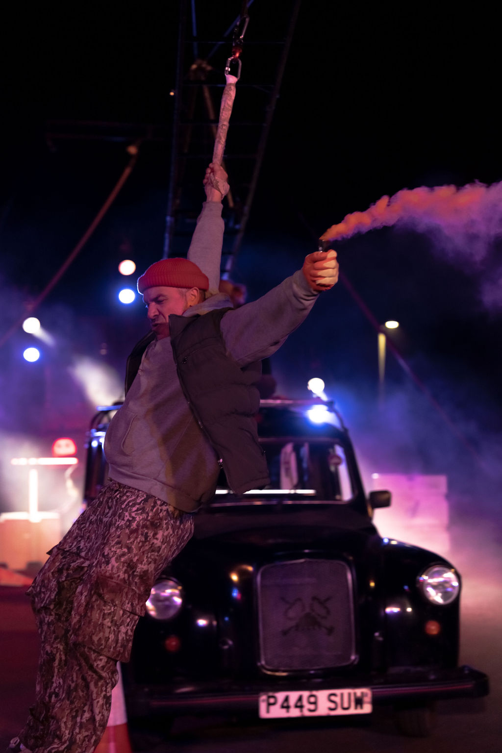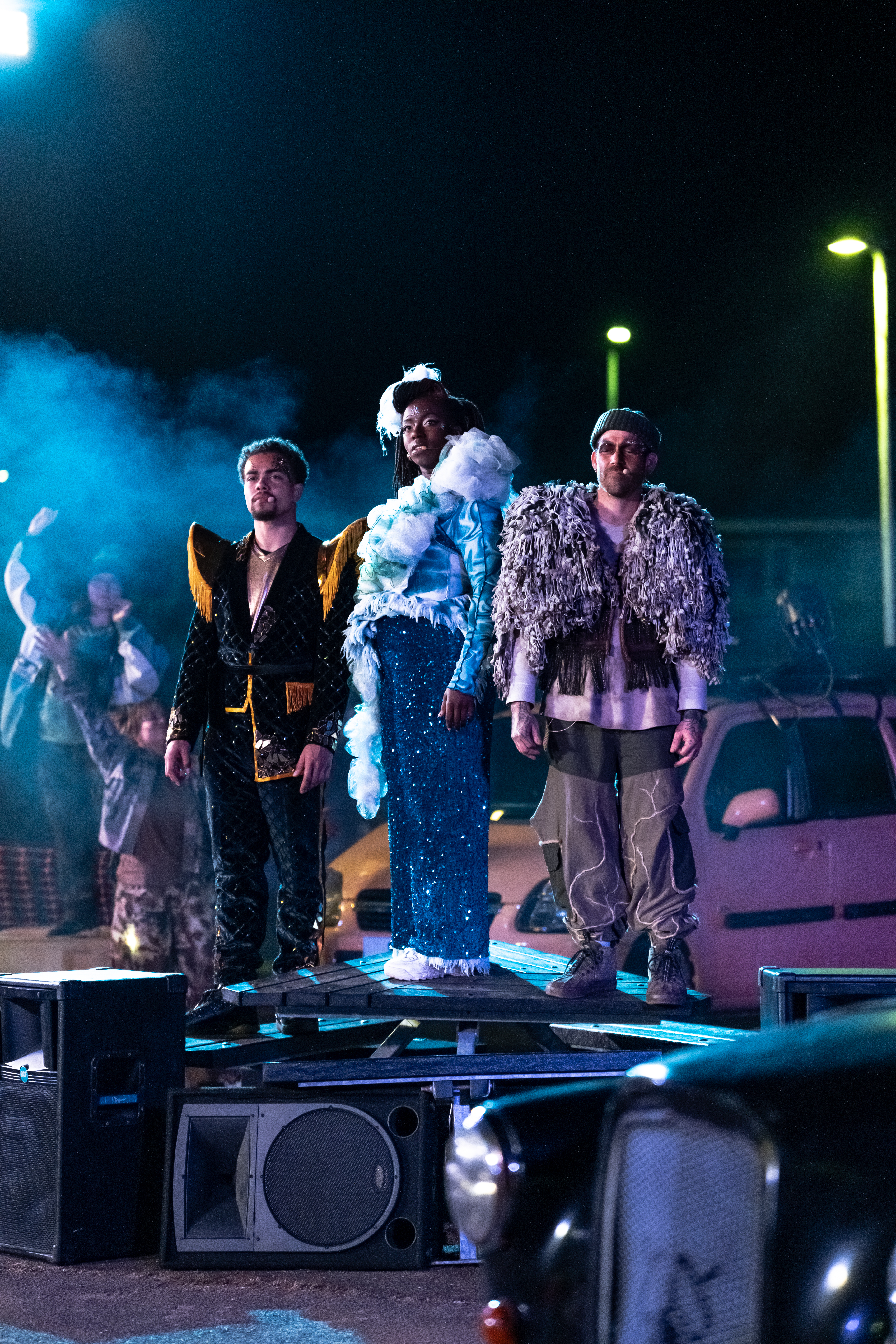 Rave New World is a spectacular new outdoor show told through lyrics, music, aerial theatre, and moving cars.