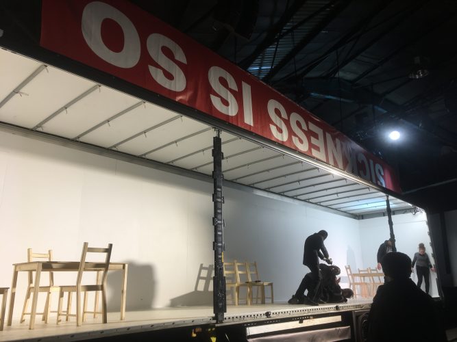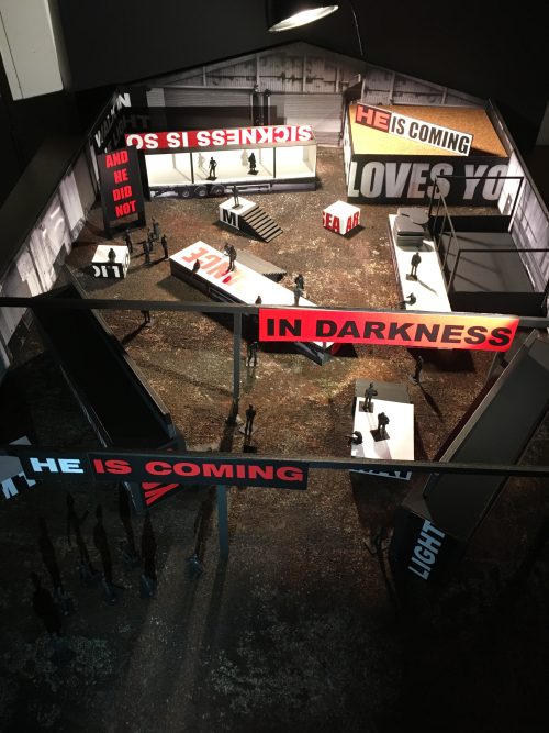 As the assistant designer, my role was to measure up the warehouse space to create technical drawings or this site specific design. This enabled me to build the modelbox at 1:50 scale for myself and the designer to populate and discuss where to place set pieces.